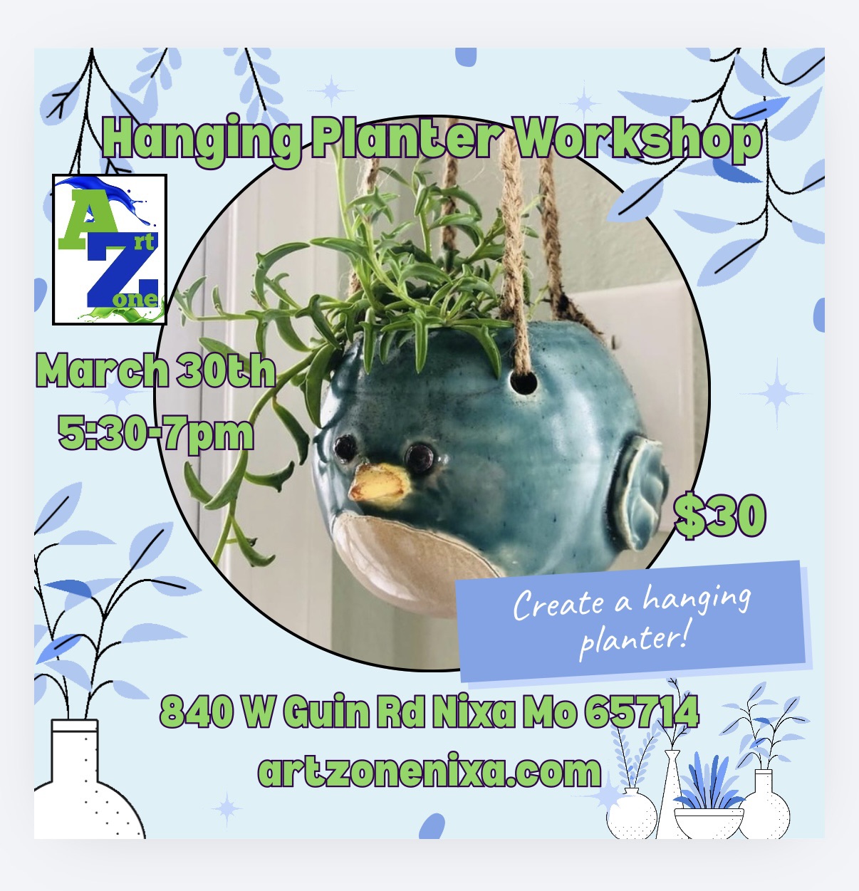 Design a hanging planter! Art Zone staff will have clay spheres pre-thrown on the pottery wheel ready for you to turn into anything! Create a hanging bird planter, cow, frog, alien or anything you can imagine.